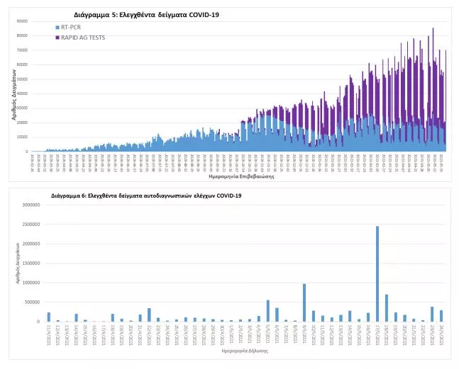 Δείγματα που έχουν ελεγχθεί: Από την 1η Ιανουαρίου 2020 μέχρι σήμερα, στα εργαστήρια που διενεργούν ελέγχους για τον νέο κορωνοϊό (SARS-CoV-2) και που δηλώνουν συστηματικά το σύνολο των δειγμάτων που ελέγχουν, έχουν συνολικά ελεγχθεί 4.998.921 κλινικά δείγματα ενώ από Μονάδες Υγείας και Κλιμάκια του ΕΟΔΥ που διενεργούν ελέγχους Rapid Ag έχουν ελεγχθεί 4.279.998 δείγματα. O μέσος όρος του επταημέρου είναι 46.985 δειγματοληπτικοί έλεγχοι.