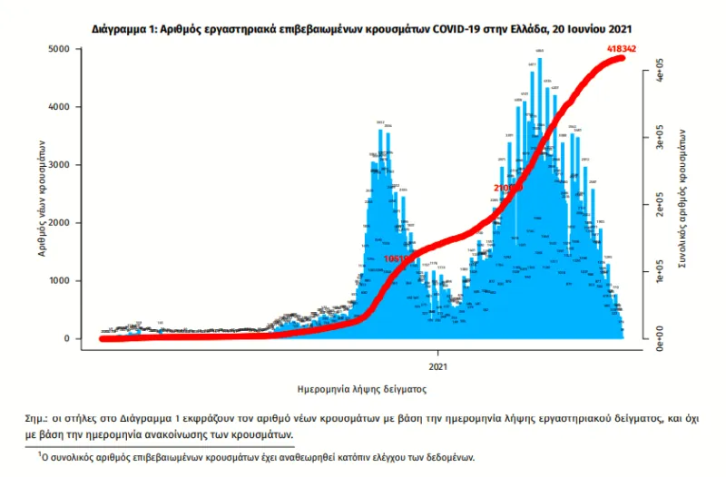 Ο συνολικός αριθμός των κρουσμάτων ανέρχεται σε 418.342 (ημερήσια μεταβολή +0.1%), εκ των οποίων 51.2% άνδρες. Με βάση τα επιβεβαιωμένα κρούσματα των τελευταίων 7 ημερών, 31 θεωρούνται σχετιζόμενα με ταξίδι από το εξωτερικό και 900 είναι σχετιζόμενα με ήδη γνωστό κρούσμα.