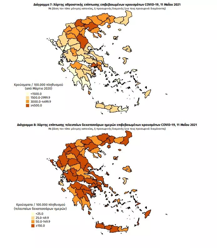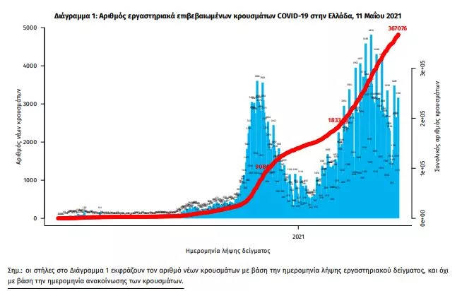 Τα στοιχεία που παρουσιάζονται αφορούν περιστατικά από την επιδημιολογική επιτήρηση της νόσου από το νέο κορωνοϊό (COVID19), με βάση τα δεδομένα που έχουν δηλωθεί στον ΕΟΔΥ και καταγραφεί μέχρι τις 11 Μαΐου 2021 (ώρα 15:00). Τα νέα εργαστηριακά επιβεβαιωμένα κρούσματα της νόσου που καταγράφηκαν τις τελευταίες 24 ώρες είναι 3.197, εκ των οποίων 14 εντοπίστηκαν κατόπιν ελέγχων στις πύλες εισόδου της χώρας. Ο συνολικός αριθμός των κρουσμάτων ανέρχεται σε 367.076 (ημερήσια μεταβολή +0.9%), εκ των οποίων 51.2% άνδρες. 1 Με βάση τα επιβεβαιωμένα κρούσματα των τελευταίων 7 ημερών, 59 θεωρούνται σχετιζόμενα με ταξίδι από το εξωτερικό και 2.617 είναι σχετιζόμενα με ήδη γνωστό κρούσμα. Ημερήσια εξέλιξη της πανδημίας: Η ημερήσια κατανομή των επιβεβαιωμένων κρουσμάτων είναι η ακόλουθη (η γραμμή παριστάνει την συνολική, αθροιστική κατανομή των κρουσμάτων).