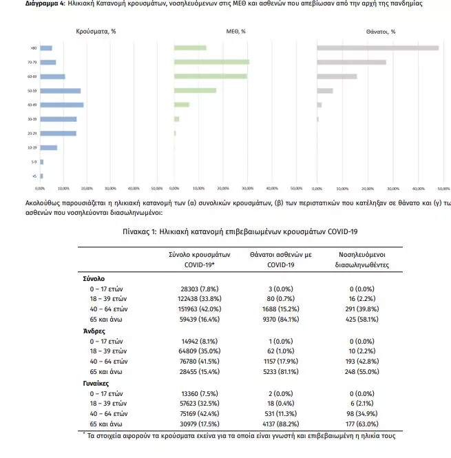 Ο αριθμός των ασθενών που νοσηλεύονται διασωληνωμένοι είναι 732 (61.7% άνδρες). Η διάμεση ηλικία τους είναι 67 έτη. To 83.3% έχει υποκείμενο νόσημα ή/και ηλικία 70 ετών και άνω. Από την αρχή της πανδημίας έχουν εξέλθει από τις ΜΕΘ 2.216 ασθενείς. Οι εισαγωγές2 νέων ασθενών Covid-19 στα νοσοκομεία της επικράτειας είναι 294 (ημερήσια μεταβολή -23.24%). Ο μέσος όρος εισαγωγών του επταημέρου είναι 364 ασθενείς.Η διάμεση ηλικία των κρουσμάτων είναι 44 έτη (εύρος 0.2 έως 106 έτη), ενώ η διάμεση ηλικία των θανόντων είναι 78 έτη (εύρος 0.2 έως 106 έτη).
