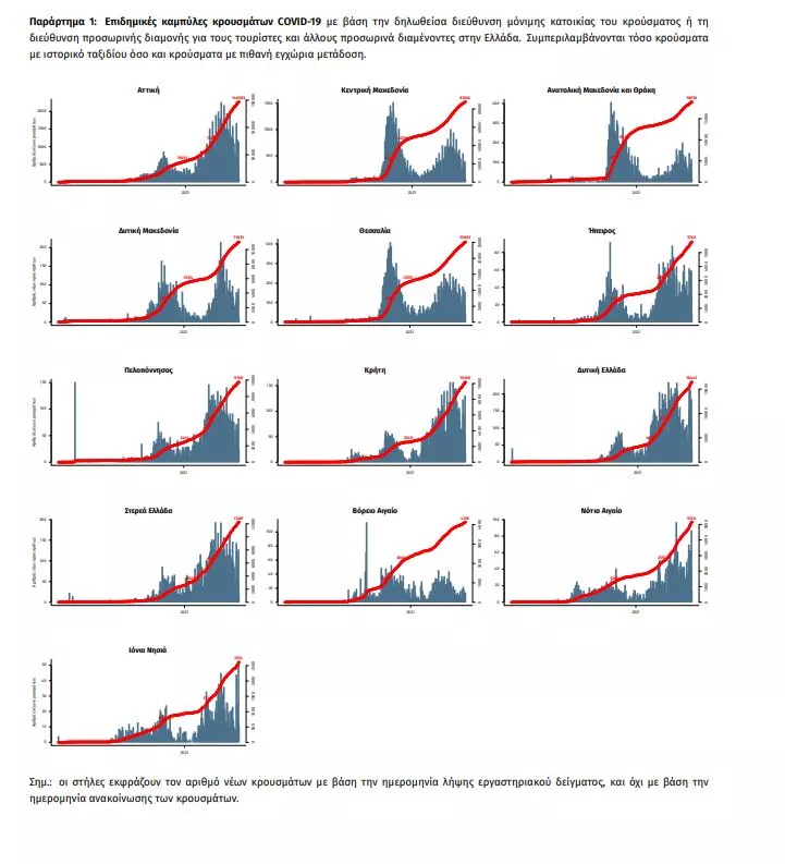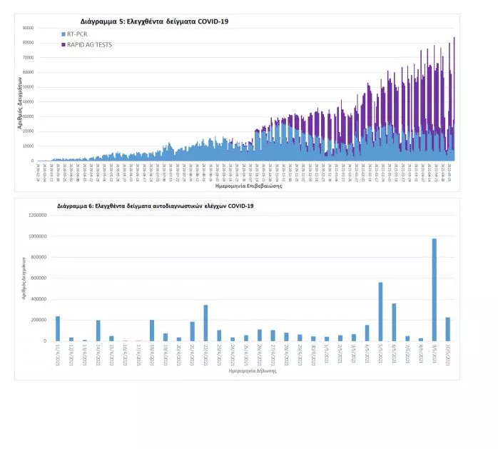 Δείγματα που έχουν ελεγχθεί: Από την 1η Ιανουαρίου 2020 μέχρι σήμερα, στα εργαστήρια που διενεργούν ελέγχους για τον νέο κορωνοϊό (SARS-CoV-2) και που δηλώνουν συστηματικά το σύνολο των δειγμάτων που ελέγχουν, έχουν συνολικά ελεγχθεί 4.794.587 κλινικά δείγματα ενώ από Μονάδες Υγείας και Κλιμάκια του ΕΟΔΥ που διενεργούν ελέγχους Rapid Ag έχουν ελεγχθεί 3.787.668 δείγματα. O μέσος όρος του επταημέρου είναι 53.042 δειγματοληπτικοί έλεγχοι.