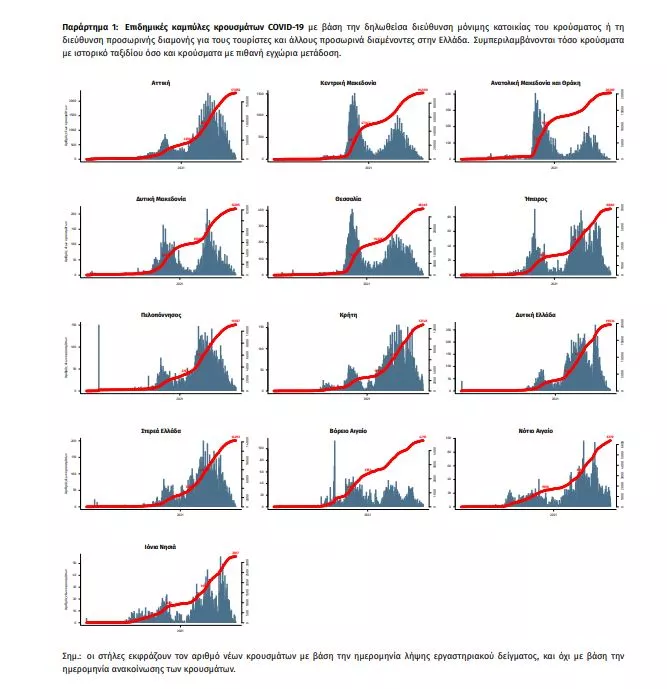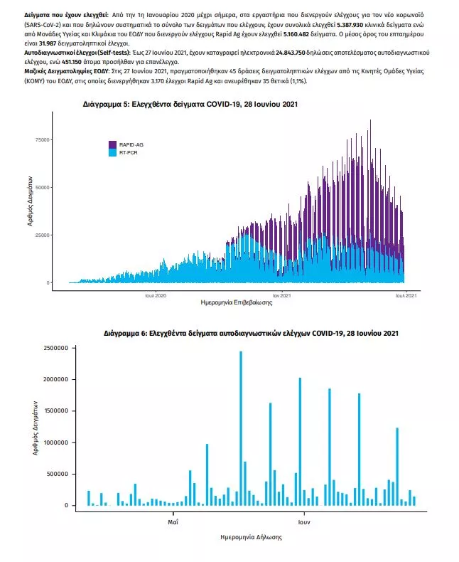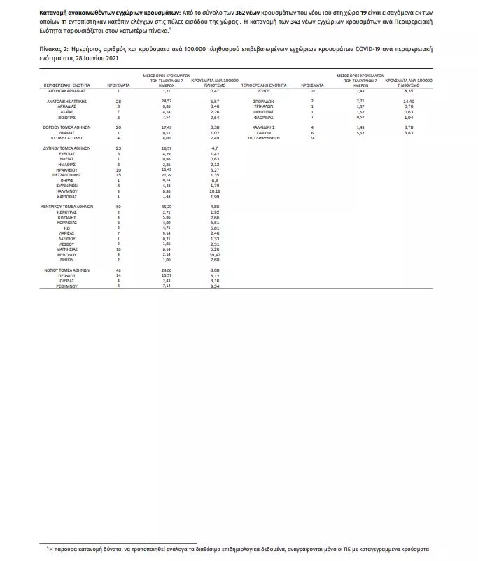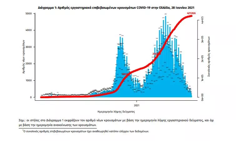 Τα στοιχεία που παρουσιάζονται αφορούν περιστατικά από την επιδημιολογική επιτήρηση της νόσου από το νέο κορωνοϊό (COVID19), με βάση τα δεδομένα που έχουν δηλωθεί στον ΕΟΔΥ και καταγραφεί μέχρι τις 28 Ιουνίου 2021 (ώρα 15:00). Τα νέα εργαστηριακά επιβεβαιωμένα κρούσματα της νόσου που καταγράφηκαν τις τελευταίες 24 ώρες είναι 362, εκ των οποίων 11 εντοπίστηκαν κατόπιν ελέγχων στις πύλες εισόδου της χώρας. Ο συνολικός αριθμός των κρουσμάτων ανέρχεται σε 421.266 (ημερήσια μεταβολή +0.1%), εκ των οποίων 51.2% άνδρες. 1 Με βάση τα επιβεβαιωμένα κρούσματα των τελευταίων 7 ημερών, 68 θεωρούνται σχετιζόμενα με ταξίδι από το εξωτερικό και 629 είναι σχετιζόμενα με ήδη γνωστό κρούσμα. Ημερήσια εξέλιξη της πανδημίας: Η ημερήσια κατανομή των επιβεβαιωμένων κρουσμάτων είναι η ακόλουθη (η γραμμή παριστάνει την συνολική, αθροιστική κατανομή των κρουσμάτων).