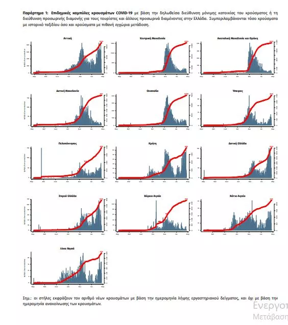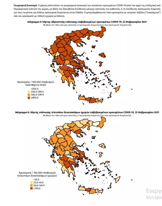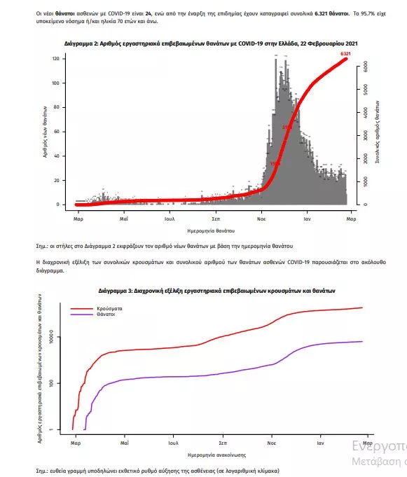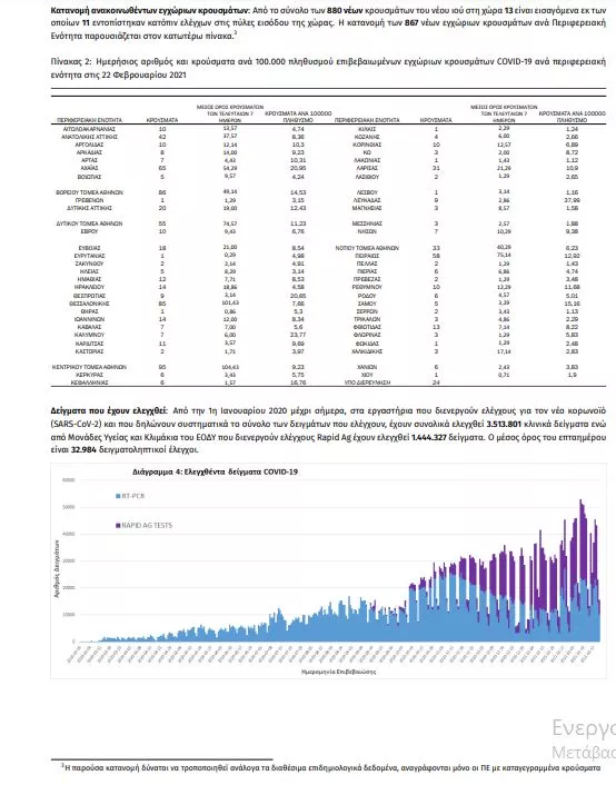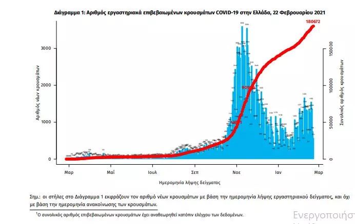 Τα στοιχεία που παρουσιάζονται αφορούν περιστατικά από την επιδημιολογική επιτήρηση της νόσου από το νέο κορωνοϊό (COVID19), με βάση τα δεδομένα που έχουν δηλωθεί στον ΕΟΔΥ και καταγραφεί μέχρι τις 22 Φεβρουαρίου 2021 (ώρα 15:00). Τα νέα εργαστηριακά επιβεβαιωμένα κρούσματα της νόσου που καταγράφηκαν τις τελευταίες 24 ώρες είναι 880, εκ των οποίων 11 εντοπίστηκαν κατόπιν ελέγχων στις πύλες εισόδου της χώρας. Ο συνολικός αριθμός των κρουσμάτων ανέρχεται σε 180.672 (ημερήσια μεταβολή +0.5%), εκ των οποίων 51.8% άνδρες. 1 Με βάση τα επιβεβαιωμένα κρούσματα των τελευταίων 7 ημερών, 43 θεωρούνται σχετιζόμενα με ταξίδι από το εξωτερικό και 2.399 είναι σχετιζόμενα με ήδη γνωστό κρούσμα. Ημερήσια εξέλιξη της πανδημίας: Η ημερήσια κατανομή των επιβεβαιωμένων κρουσμάτων είναι η ακόλουθη (η γραμμή παριστάνει την συνολική, αθροιστική κατανομή των κρουσμάτων).