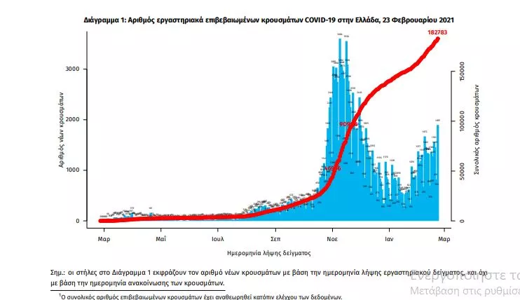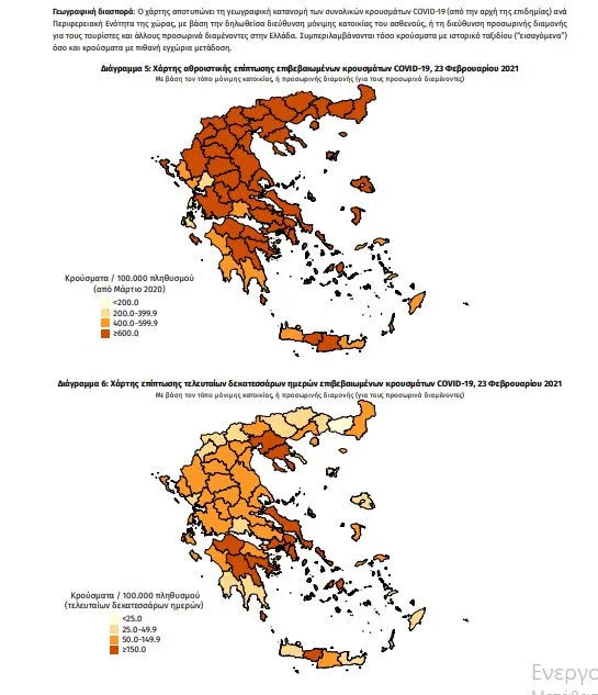 Τα στοιχεία που παρουσιάζονται αφορούν περιστατικά από την επιδημιολογική επιτήρηση της νόσου από το νέο κορωνοϊό (COVID19), με βάση τα δεδομένα που έχουν δηλωθεί στον ΕΟΔΥ και καταγραφεί μέχρι τις 23 Φεβρουαρίου 2021 (ώρα 15:00).