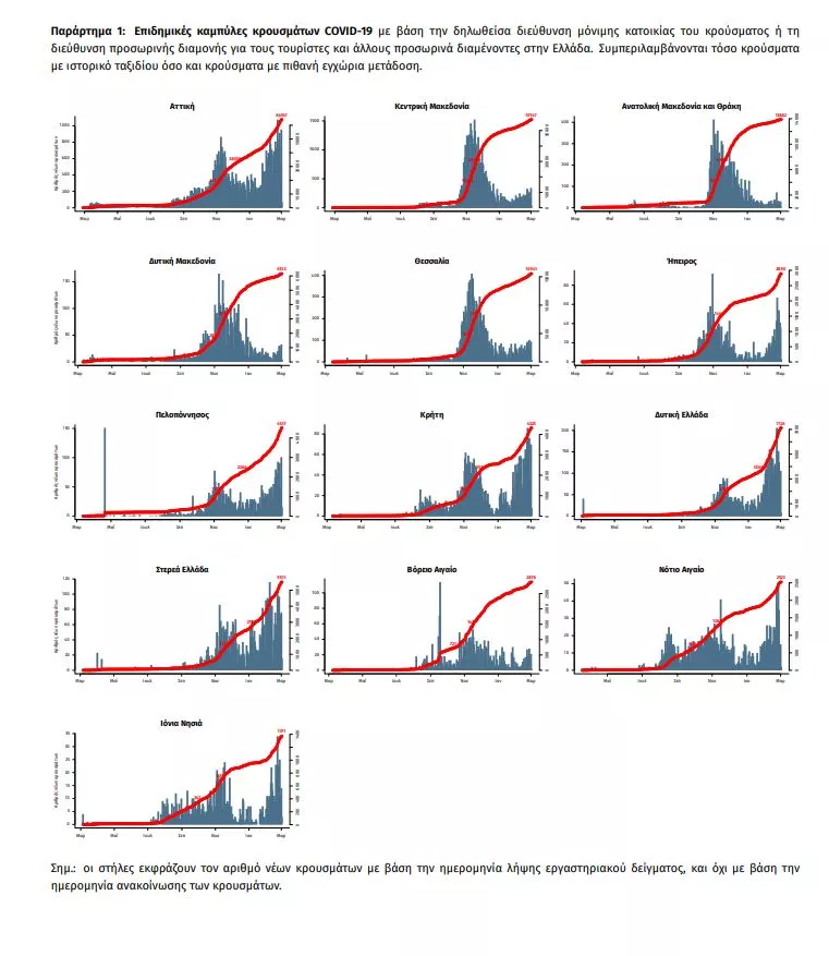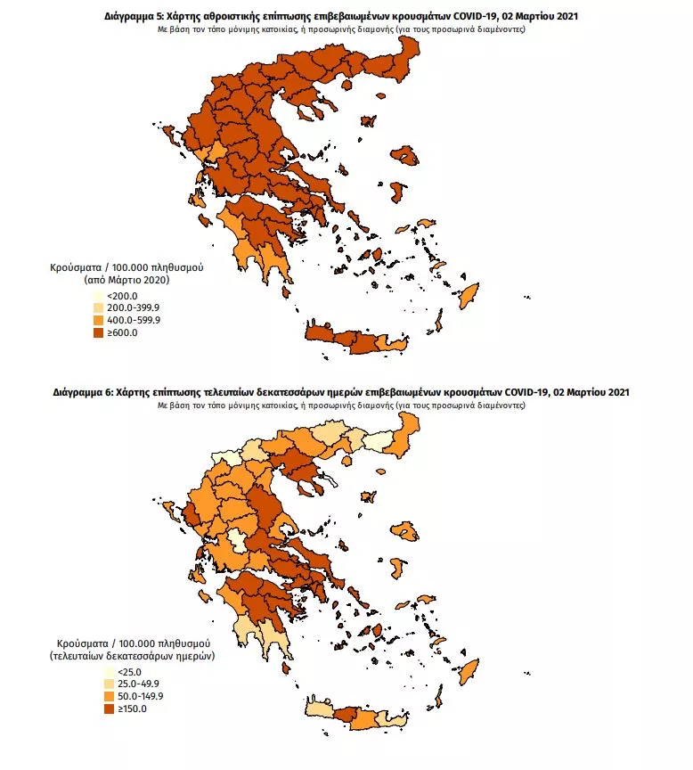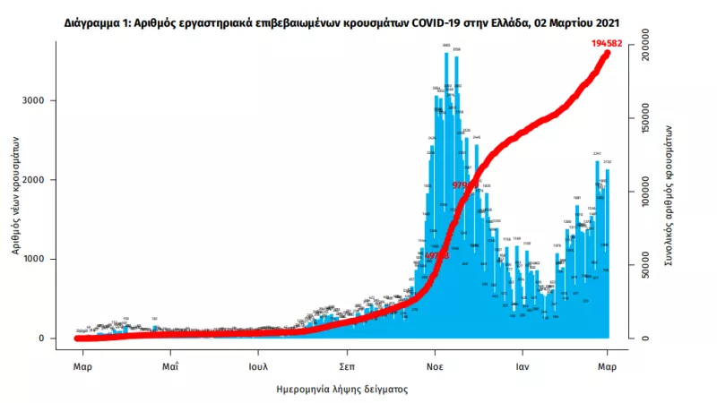 Τα νέα εργαστηριακά επιβεβαιωμένα κρούσματα της νόσου που καταγράφηκαν τις τελευταίες 24 ώρες είναι 2.353, εκ των οποίων 18 εντοπίστηκαν κατόπιν ελέγχων στις πύλες εισόδου της χώρας. Ο συνολικός αριθμός των κρουσμάτων ανέρχεται σε194.582 (ημερήσια μεταβολή +1.2%), εκ των οποίων 51.8% άνδρες. Με βάση τα επιβεβαιωμένα κρούσματα των τελευταίων 7 ημερών, 60 θεωρούνται σχετιζόμενα με ταξίδι από το εξωτερικό και 2.368 είναι σχετιζόμενα με ήδη γνωστό κρούσμα.