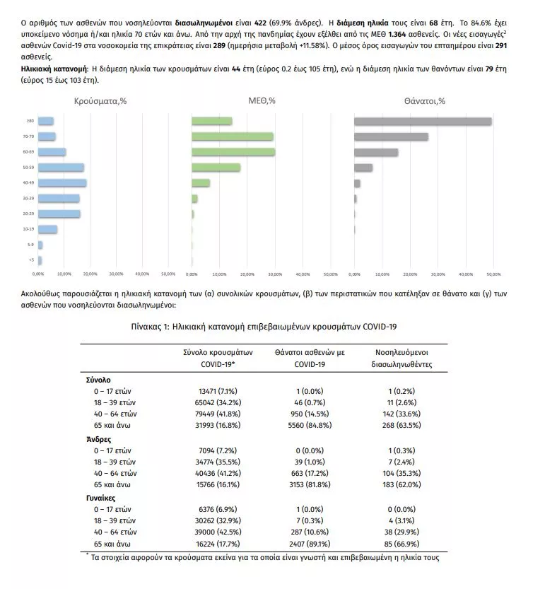 Ο αριθμός των ασθενών που νοσηλεύονται διασωληνωμένοι είναι 422 (69.9% άνδρες). Η διάμεση ηλικία τους είναι 68έτη. To 84.6% έχει υποκείμενο νόσημα ή/και ηλικία 70 ετών και άνω. Από την αρχή της πανδημίας έχουν εξέλθει από τις ΜΕΘ 1.364 ασθενείς. Οι νέες εισαγωγές ασθενών Covid-19 στα νοσοκομεία της επικράτειας είναι 289 (ημερήσια μεταβολή +11.58%). Ο μέσος όρος εισαγωγών του επταημέρου είναι 291 ασθενείς.