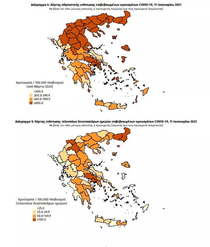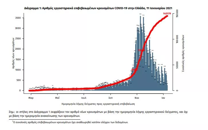 Τα στοιχεία που παρουσιάζονται αφορούν περιστατικά από την επιδημιολογική επιτήρηση της νόσου από το νέο κορωνοϊό (COVID19), με βάση τα δεδομένα που έχουν δηλωθεί στον ΕΟΔΥ και καταγραφεί μέχρι τις 11 Ιανουαρίου 2021 (ώρα 15:00). Τα νέα εργαστηριακά επιβεβαιωμένα κρούσματα της νόσου είναι 444, εκ των οποίων 12 εντοπίστηκαν κατόπιν ελέγχων στις πύλες εισόδου της χώρας. Ο συνολικός αριθμός των κρουσμάτων ανέρχεται σε 145179 (ημερήσια μεταβολή +0.3%), εκ των οποίων 52.2% άνδρες. 1 Οι νέοι θάνατοι ασθενών με COVID-19 είναι 39, ενώ από την έναρξη της επιδημίας έχουν καταγραφεί συνολικά 5302 θάνατοι. Η διάμεση ηλικία των ασθενών που απεβίωσαν είναι 79 έτη. Ο αριθμός των ασθενών που νοσηλεύονται διασωληνωμένοι είναι 350 (69.1% άνδρες). Η ημερήσια κατανομή των επιβεβαιωμένων κρουσμάτων είναι η ακόλουθη (η γραμμή παριστάνει την συνολική, αθροιστική κατανομή των κρουσμάτων).