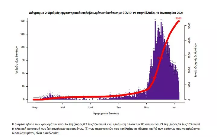 Τέλος, έχουμε 39 νέους θανάτους από τη νόσο COVID-19, φθάνοντας τους 5302 θανάτους συνολικά στη χώρα, εκ των οποίων 3130 (59.0%) άνδρες. Η διάμεση ηλικία των θανόντων συμπολιτών μας ήταν τα 79 έτη και το 95.5% είχε κάποιο υποκείμενο νόσημα ή/και ηλικία 70 ετών και άνω.