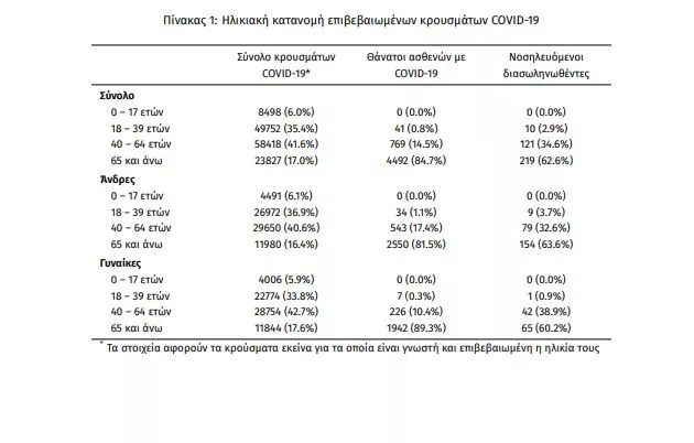 Η διάμεση ηλικία των κρουσμάτων είναι 44 έτη (εύρος 0.2 έως 104 ετών), ενώ η διάμεση ηλικία των θανάτων είναι 79 έτη (εύρος 24 έως 103 ετών). Η ηλικιακή κατανομή των (α) συνολικών κρουσμάτων, (β) των περιστατικών που κατέληξαν σε θάνατο και (γ) των ασθενών που νοσηλεύονται διασωληνωμένοι, είναι η ακόλουθη: