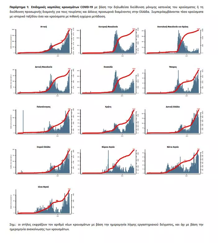 Τα στοιχεία που παρουσιάζονται αφορούν περιστατικά από την επιδημιολογική επιτήρηση της νόσου από το νέο κορωνοϊό (COVID19), με βάση τα δεδομένα που έχουν δηλωθεί στον ΕΟΔΥ και καταγραφεί μέχρι τις 30 Μαρτίου 2021 (ώρα 15:00).Τα νέα εργαστηριακά επιβεβαιωμένα κρούσματα της νόσου που καταγράφηκαν τις τελευταίες 24 ώρες είναι 4.340, εκ των οποίων 21 εντοπίστηκαν κατόπιν ελέγχων στις πύλες εισόδου της χώρας. Ο συνολικός αριθμός των κρουσμάτων ανέρχεται σε 260.077 (ημερήσια μεταβολή +1.7%), εκ των οποίων 51.5% άνδρες. 1 Με βάση τα επιβεβαιωμένα κρούσματα των τελευταίων 7 ημερών, 86 θεωρούνται σχετιζόμενα με ταξίδι από το εξωτερικό και 2.267 είναι σχετιζόμενα με ήδη γνωστό κρούσμα. Ημερήσια εξέλιξη της πανδημίας: Η ημερήσια κατανομή των επιβεβαιωμένων κρουσμάτων είναι η ακόλουθη (η γραμμή παριστάνει την συνολική, αθροιστική κατανομή των κρουσμάτων).