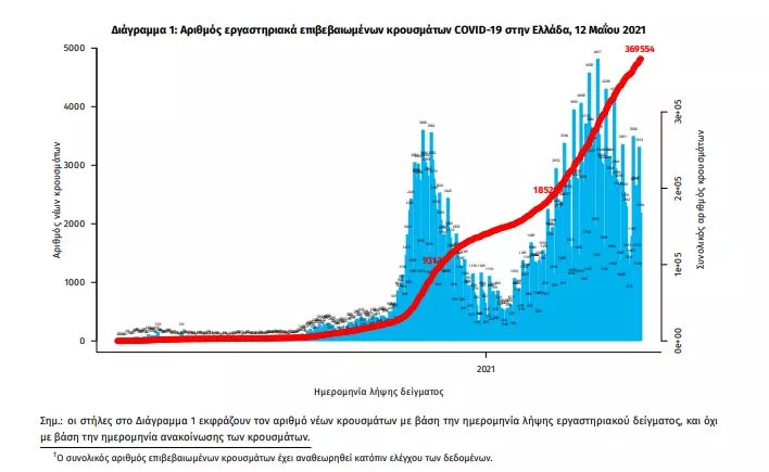 Τα στοιχεία που παρουσιάζονται αφορούν περιστατικά από την επιδημιολογική επιτήρηση της νόσου από το νέο κορωνοϊό (COVID19), με βάση τα δεδομένα που έχουν δηλωθεί στον ΕΟΔΥ και καταγραφεί μέχρι τις 12 Μαΐου 2021 (ώρα 15:00). Τα νέα εργαστηριακά επιβεβαιωμένα κρούσματα της νόσου που καταγράφηκαν τις τελευταίες 24 ώρες είναι 2.489, εκ των οποίων 5 εντοπίστηκαν κατόπιν ελέγχων στις πύλες εισόδου της χώρας. Ο συνολικός αριθμός των κρουσμάτων ανέρχεται σε 369.554 (ημερήσια μεταβολή +0.7%), εκ των οποίων 51.2% άνδρες. 1 Με βάση τα επιβεβαιωμένα κρούσματα των τελευταίων 7 ημερών, 49 θεωρούνται σχετιζόμενα με ταξίδι από το εξωτερικό και 2.616 είναι σχετιζόμενα με ήδη γνωστό κρούσμα.