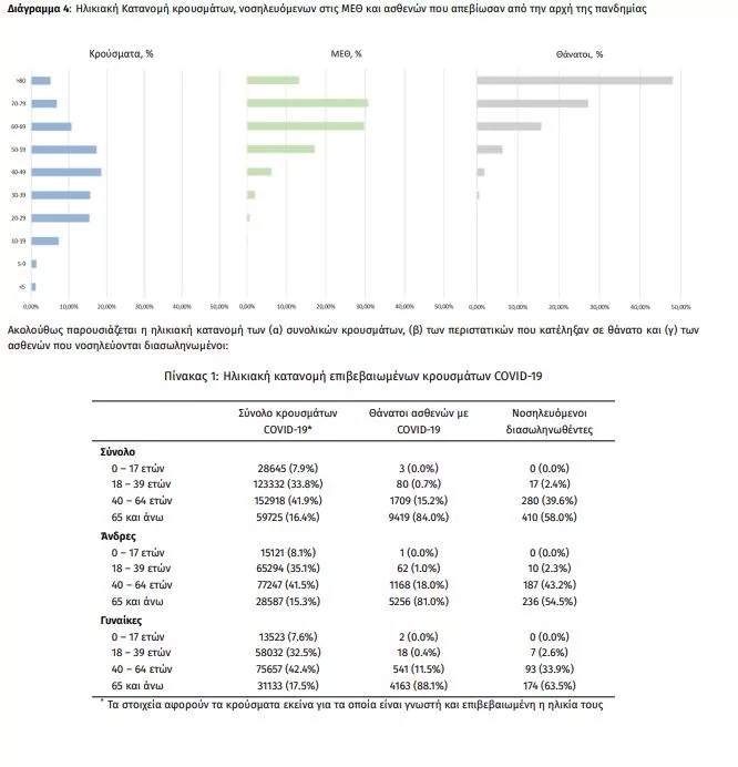 Ο αριθμός των ασθενών που νοσηλεύονται διασωληνωμένοι είναι 707 (61.5% άνδρες). Η διάμεση ηλικία τους είναι 67 έτη. To 82.9% έχει υποκείμενο νόσημα ή/και ηλικία 70 ετών και άνω. Από την αρχή της πανδημίας έχουν εξέλθει από τις ΜΕΘ 2.226 ασθενείς. Οι εισαγωγές2 νέων ασθενών Covid-19 στα νοσοκομεία της επικράτειας είναι 318 (ημερήσια μεταβολή +8.16%). Ο μέσος όρος εισαγωγών του επταημέρου είναι 357 ασθενείς.Η διάμεση ηλικία των κρουσμάτων είναι 44 έτη (εύρος 0.2 έως 106 έτη), ενώ η διάμεση ηλικία των θανόντων είναι 78 έτη (εύρος 0.2 έως 106 έτη).