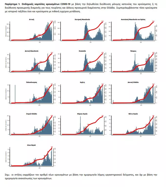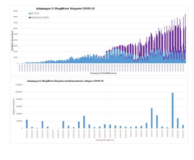 Δείγματα που έχουν ελεγχθεί: Από την 1η Ιανουαρίου 2020 μέχρι σήμερα, στα εργαστήρια που διενεργούν ελέγχους για τον νέο κορωνοϊό (SARS-CoV-2) και που δηλώνουν συστηματικά το σύνολο των δειγμάτων που ελέγχουν, έχουν συνολικά ελεγχθεί 4.813.086 κλινικά δείγματα ενώ από Μονάδες Υγείας και Κλιμάκια του ΕΟΔΥ που διενεργούν ελέγχους Rapid Ag έχουν ελεγχθεί 3.832.276 δείγματα. O μέσος όρος του επταημέρου είναι 57.206 δειγματοληπτικοί έλεγχοι.