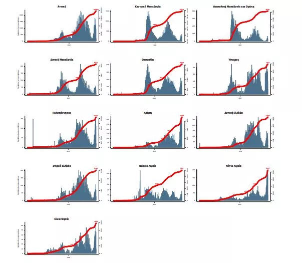 Παράρτημα 1: Επιδημικές καμπύλες κρουσμάτων COVID-19 με βάση την δηλωθείσα διεύθυνση μόνιμης κατοικίας του κρούσματος ή τη διεύθυνση προσωρινής διαμονής για τους τουρίστες και άλλους προσωρινά διαμένοντες στην Ελλάδα. Συμπεριλαμβάνονται τόσο κρούσματα με ιστορικό ταξιδίου όσο και κρούσματα με πιθανή εγχώρια μετάδοση.