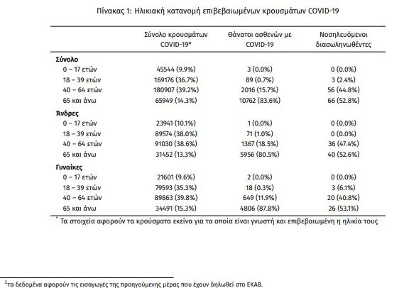 Οι νέοι θάνατοι ασθενών με COVID-19 είναι 3, ενώ από την έναρξη της επιδημίας έχουν καταγραφεί συνολικά 12.870 θάνατοι. Το 95.1% είχε υποκείμενο νόσημα ή/και ηλικία 70 ετών και άνω.