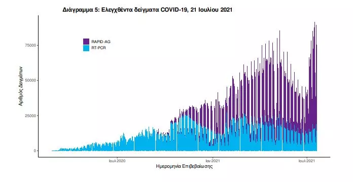Mαζικές Δειγματοληψίες ΕΟΔΥ: Στις 20 Ιουλίου 2021, πραγματοποιήθηκαν 135 δράσεις δειγματοληπτικών ελέγχων από τις Κινητές Ομάδες Υγείας (ΚΟΜΥ) του ΕΟΔΥ, στις οποίες διενεργήθηκαν 21.641 έλεγχοι Rapid Ag και ανευρέθηκαν 500 θετικά (2,31%).