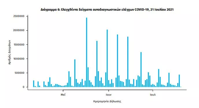 Αυτοδιαγνωστικοί έλεγχοι (Self-tests): Έως 20 Ιουλίου 2021, έχουν καταγραφεί ηλεκτρονικά 29.261.358 δηλώσεις αποτελέσματος αυτοδιαγνωστικού ελέγχου. Από τα 677.282 άτομα που προσήλθαν για επανέλεγχο, έχουν καταγραφεί 55.691 θετικά αποτελέσματα.