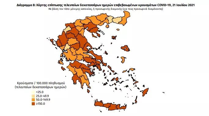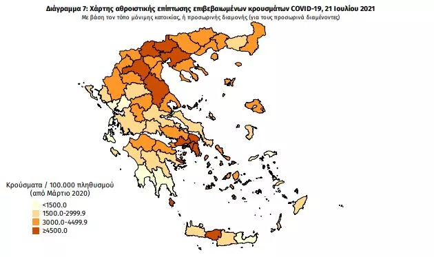 Γεωγραφική διασπορά: Ο χάρτης αποτυπώνει τη γεωγραφική κατανομή των συνολικών κρουσμάτων COVID-19 (από την αρχή της επιδημίας) ανά Περιφερειακή Ενότητα της χώρας, με βάση την δηλωθείσα διεύθυνση μόνιμης κατοικίας του ασθενούς, ή τη διεύθυνση προσωρινής διαμονής για τους τουρίστες και άλλους προσωρινά διαμένοντες στην Ελλάδα. Συμπεριλαμβάνονται τόσο κρούσματα με ιστορικό ταξιδίου (“εισαγόμενα”) όσο και κρούσματα με πιθανή εγχώρια μετάδοση