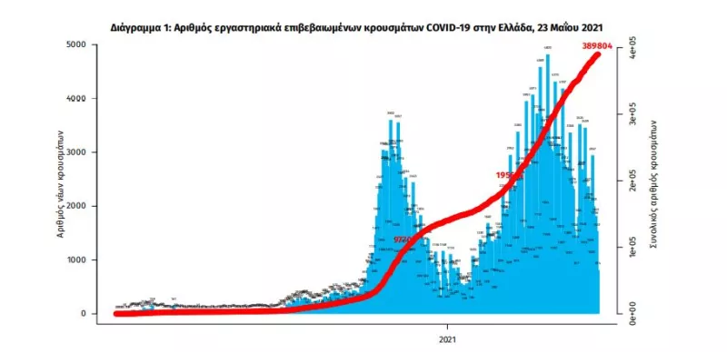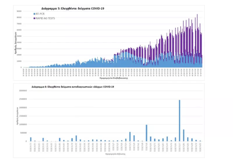 Δείγματα που έχουν ελεγχθεί: Από την 1η Ιανουαρίου 2020 μέχρι σήμερα, στα εργαστήρια που διενεργούν ελέγχους για τον νέο κορωνοϊό (SARS-CoV-2) και που δηλώνουν συστηματικά το σύνολο των δειγμάτων που ελέγχουν, έχουν συνολικά ελεγχθεί 4.972.207 κλινικά δείγματα ενώ από Μονάδες Υγείας και Κλιμάκια του ΕΟΔΥ που διενεργούν ελέγχους Rapid Ag έχουν ελεγχθεί 4.215.435 δείγματα. O μέσος όρος του επταημέρου είναι 47.352 δειγματοληπτικοί έλεγχοι.