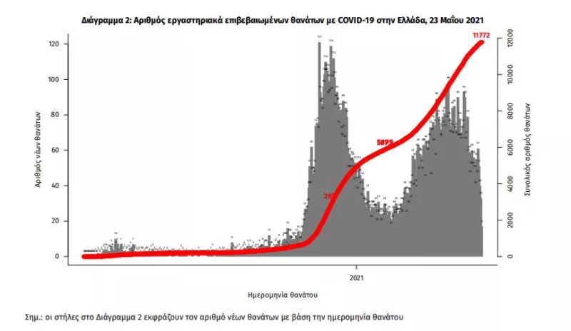 Οι νέοι θάνατοι ασθενών με COVID-19 είναι 38, ενώ από την έναρξη της επιδημίας έχουν καταγραφεί συνολικά 11.772 θάνατοι. Το 95.2% είχε υποκείμενο νόσημα ή/και ηλικία 70 ετών και άνω.