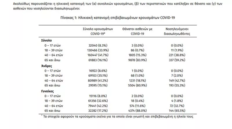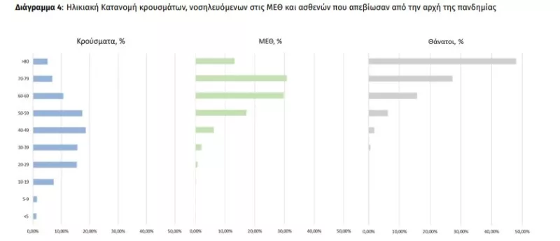 Ο αριθμός των ασθενών που νοσηλεύονται διασωληνωμένοι είναι 569 (61.7% άνδρες). Η διάμεση ηλικία τους είναι 67 έτη. To 84.0% έχει υποκείμενο νόσημα ή/και ηλικία 70 ετών και άνω. Από την αρχή της πανδημίας έχουν εξέλθει από τις ΜΕΘ 2.348 ασθενείς. Οι εισαγωγές νέων ασθενών Covid-19 στα νοσοκομεία της επικράτειας είναι 229 (ημερήσια μεταβολή -14.23%). Ο μέσος όρος εισαγωγών του επταημέρου είναι 287 ασθενείς. Η διάμεση ηλικία των κρουσμάτων είναι 44 έτη (εύρος 0.2 έως 106 έτη), ενώ η διάμεση ηλικία των θανόντων είναι 78 έτη (εύρος 0.2 έως 106 έτη).