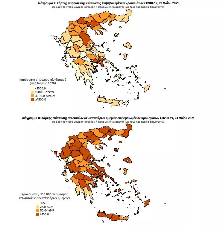 Τα στοιχεία που παρουσιάζονται αφορούν περιστατικά από την επιδημιολογική επιτήρηση της νόσου από το νέο κορωνοϊό (COVID19), με βάση τα δεδομένα που έχουν δηλωθεί στον ΕΟΔΥ και καταγραφεί μέχρι τις 23 Μαΐου 2021 (ώρα 15:00).