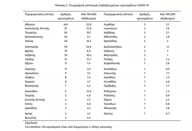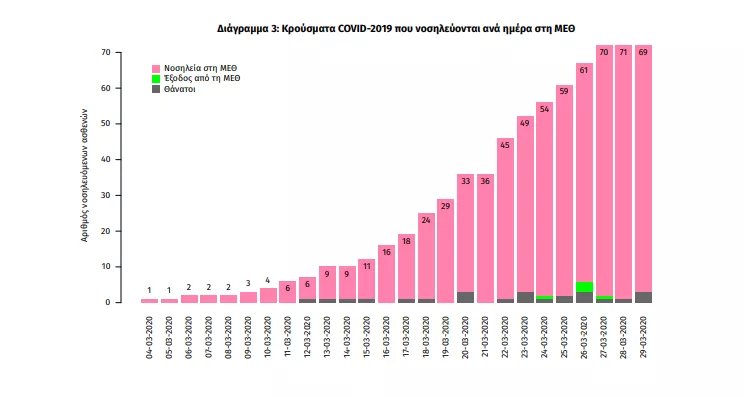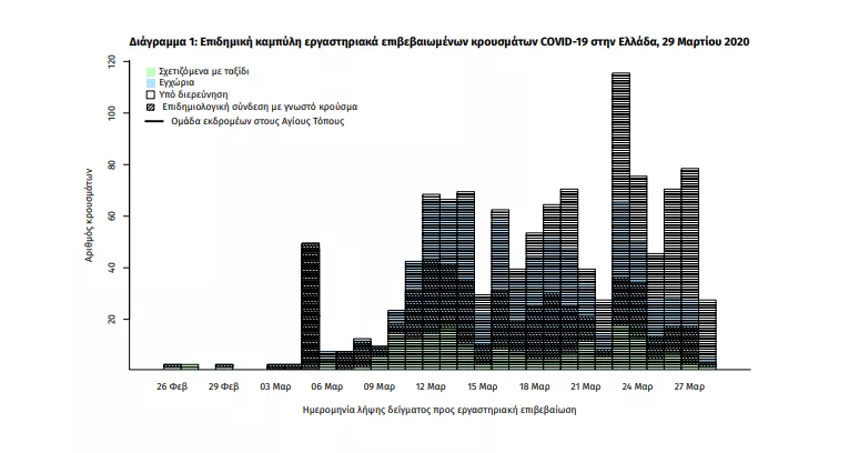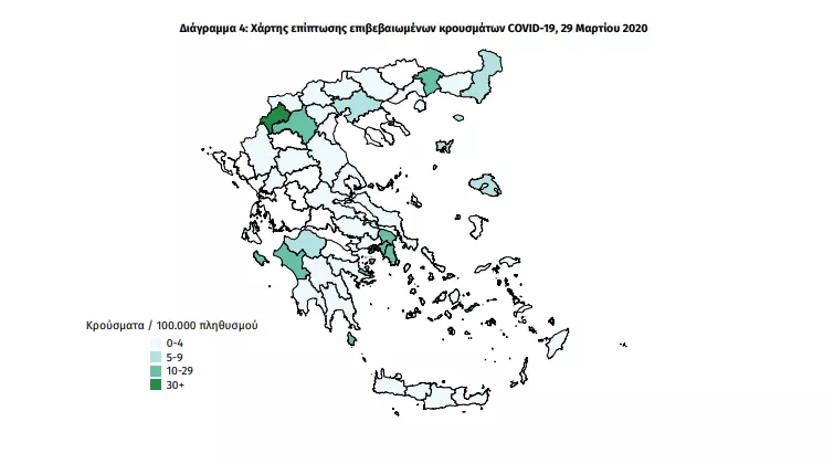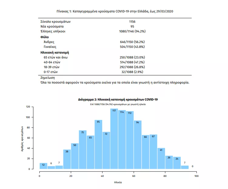 Σε πρόσφατη έκθεση του ΕΟΔΥ παρουσιάζονται τα ευρήματα από την επιδημιολογική επιτήρηση της νόσου από το νέο κορωνοϊό (COVID-19) στην Ελλάδα, με βάση τα στοιχεία που έχουν δηλωθεί στον ΕΟΔΥ και καταγραφεί μέχρι τις 29 Μαρτίου 2020 και ώρα 15:00.