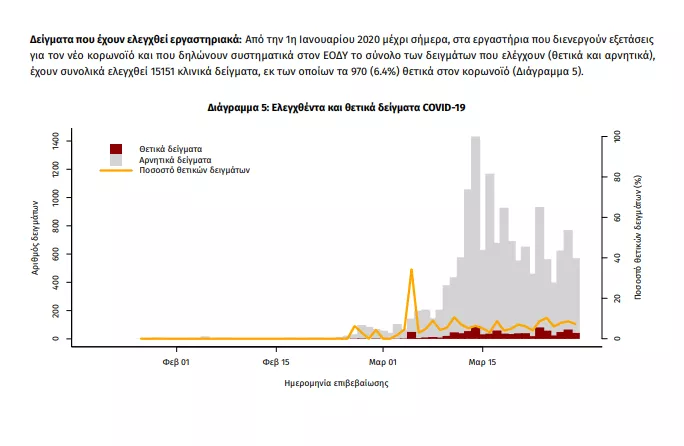 έχουν συνολικά ελεγχθεί 15151 κλινικά δείγματα, εκ των οποίων τα 970 (6.4%) θετικά στον κορωνοϊό (Διάγραμμα 5).