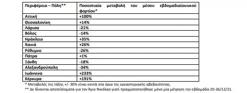 Πίνακας 1: Ποσοστιαία μεταβολή στη μέση συγκέντρωση του ιικού φορτίου του SARS-CoV-2 στα αστικά λύματα ανά 100.000 κατοίκους την εβδομάδα 20–26/12/2021 σε σχέση με την εβδομάδα 13–19/12/2021.