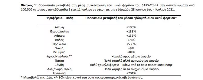 Την εβδομάδα 5 έως 11 Ιουλίου 2021, παρατηρήθηκαν αυξητικές τάσεις, σε σχέση με την εβδομάδα 28 Ιουνίου έως 4 Ιουλίου 2021, στο ιικό φορτίο του SARS-CoV-2 στα αστικά λύματα των επτά από τις δώδεκα (7/12) περιοχέςπου ελέγχθηκαν από το Εθνικό Δίκτυο Επιδημιολογίας Λυμάτων του ΕΟΔΥ. Οι αυξητικές μεταβολές κυμάνθηκαν από +76% στο Βόλο έως +530% στο Ηράκλειο.