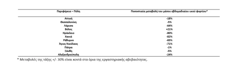 Οι καθαρά πτωτικές μεταβολές παρατηρήθηκαν στα Χανιά, στο Ηράκλειο, στο Ρέθυμνο, στον Άγιο Νικόλαο και στη Λάρισα με εύρος από -64% έως -82%, ενώ οριακά πτωτικές παρουσιάστηκαν οι μεταβολές στην Αλεξανδρούπολη (-24%) και στην Περιφέρεια Αττικής (-18%).