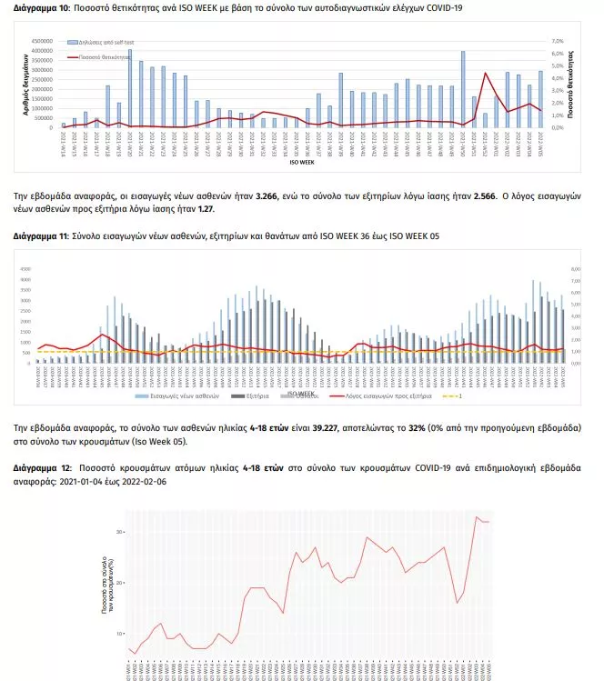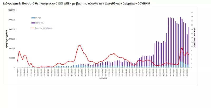 Την εβδομάδα αναφοράς, το ποσοστό θετικότητας ήταν 5.92% σε σύνολο 2.100.844 εργαστηριακών ελέγχων (RT-PCR/Rapid-Ag) και 1.40% σε σύνολο 2.952.107 αυτοδιαγνωστικών ελέγχων.