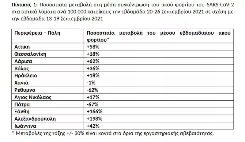 Την εβδομάδα 20 έως 26 Σεπτεμβρίου 2021, παρατηρήθηκαν αυξητικές τάσεις, σε σχέση με την εβδομάδα 13 έως 19 Σεπτεμβρίου 2021, στο μέσο εβδομαδιαίο ιικό φορτίο του SARS-CoV-2 στα αστικά λύματα των εννέα από τις δώδεκα (9/12) περιοχές που ελέγχθηκαν από το Εθνικό Δίκτυο Επιδημιολογίας Λυμάτων (ΕΔΕΛ) του ΕΟΔΥ.