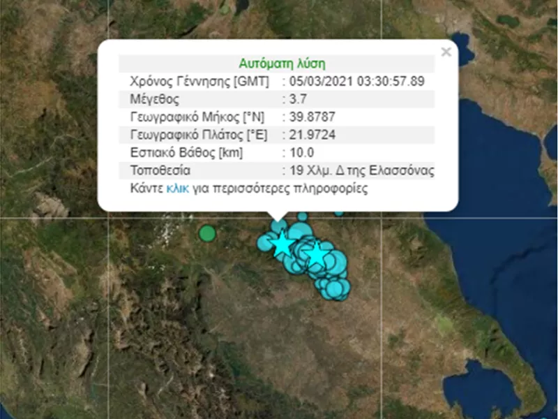 Μετασεισμός μεγέθους 3,7 Ρίχτερ ανησύχησε στις 05:30 τα ξημερώματα της Παρασκευής τους κατοίκους της Ελασσόνας. Ήταν ο ισχυρότερος από τους συνολικά 24 μετασεισμούς που σημειώθηκαν μετά τα μεσάνυχτα στη περιοχή.