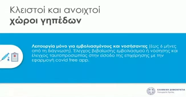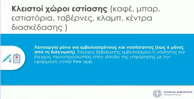 - -Στους κλειστούς χώρους καταστημάτων εστίασης και κέντρων διασκέδασης, θα εισέρχονται μόνον όσοι έχουν εμβολιαστεί ή έχουν πιστοποιητικό νόσησης.