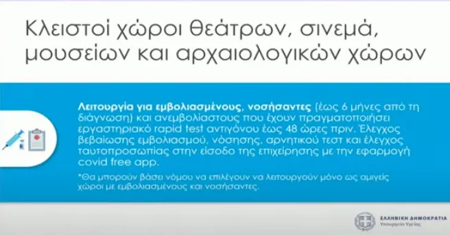 - -Θέατρα, κινηματογράφοι, μουσεία: Θα μπορούν να εισέρχονται και ανεμβολίαστοι με rapid test 48 ωρών. Οι επιχειρήσεις αυτές θα μπορούν να επιλέξουν αν θα είναι αμιγείς (με 100% χωρητικότητα) ή μεικτές.