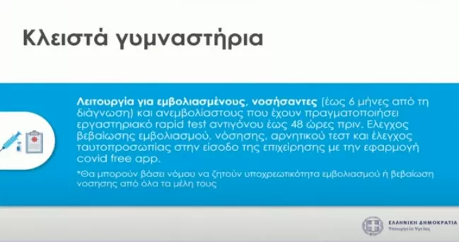 - -Κλειστά γυμναστήρια: Λειτουργία για εμβολιασμένους, νοσήσαντες και ανεμβολίαστους με αρνητικό rapid test 48 ωρών