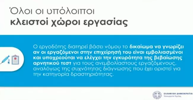 - -Σε κλειστούς χώρους εργασίας ο εργοδότης διατηρεί βάσει νόμου το δικαίωμα να γνωρίζει αν οι εργαζόμενοι είναι εμβολιασμένοι.