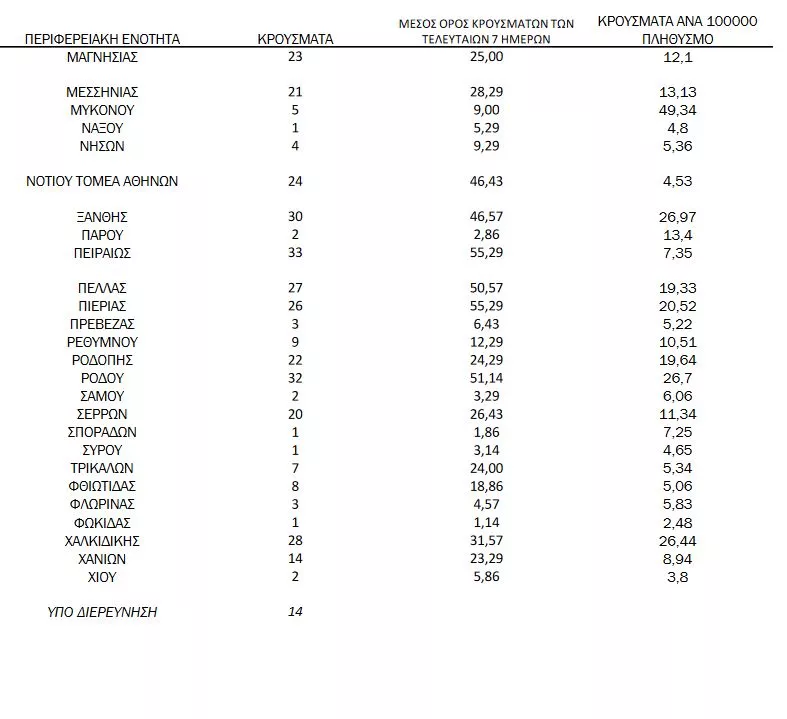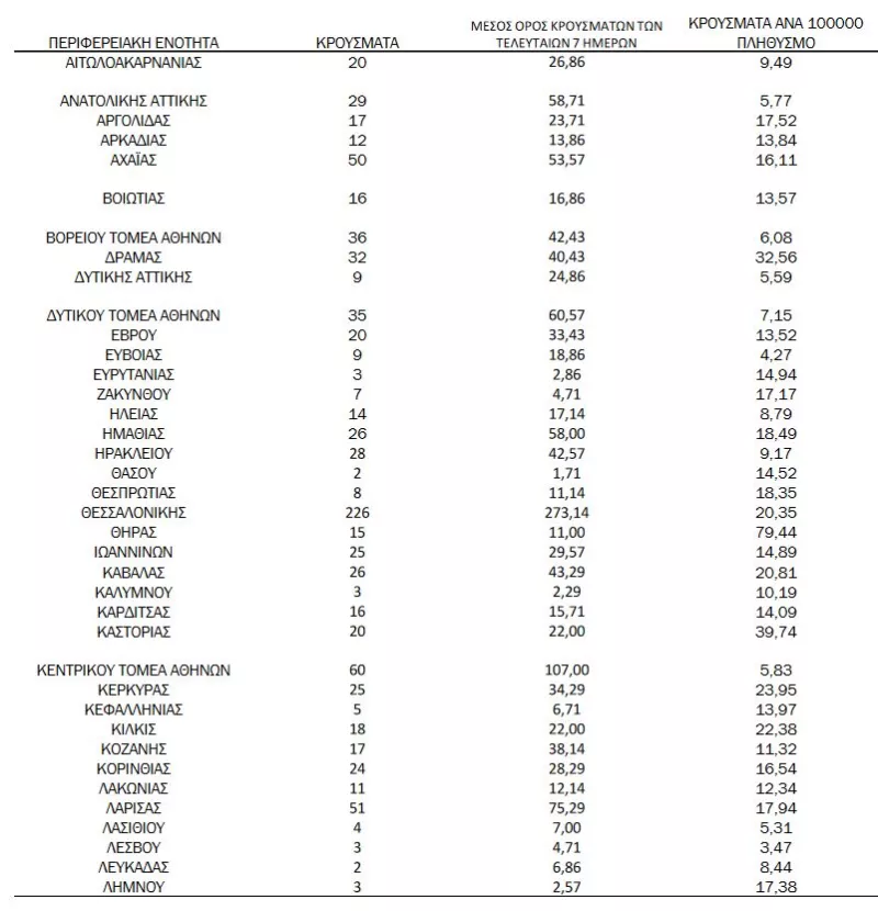 Αναλυτικά ο αριθμός των κρουσμάτων ανά περιφερειακή ενότητα: