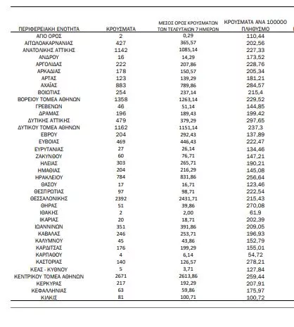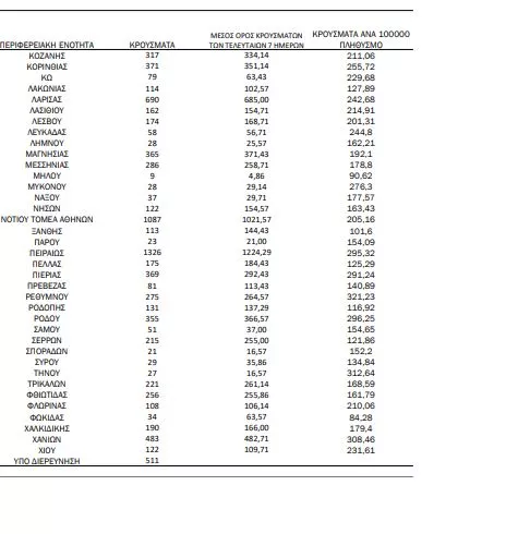Οι περιφέρειες – πλην Αττικής και Θεσσαλονίκης – που καταγράφουν περισσότερα από 100 κρούσματα, είναι: