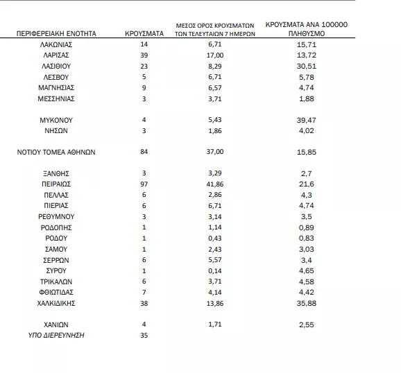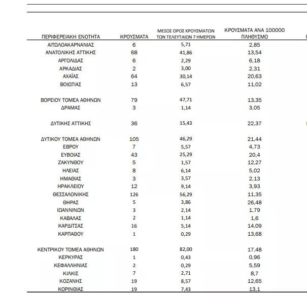 Σε ό,τι αφορά στην κατανομή των κρουσμάτων covid-19 που ανακοίνωσε ο ΕΟΔΥ για την υπόλοιπη Ελλάδα έχει ως εξής: