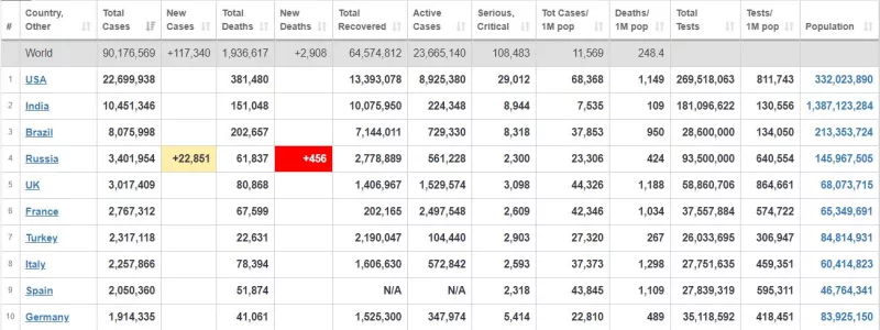 Συνολικά, τα κρούσματα έχουν φτάσει τα 90.176.569 παγκοσμίως και οι θάνατοι τους 1.936.617.
