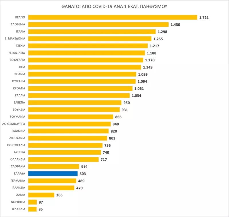 Στην Ευρώπη η Ελλάδα κατέχει την 23η θέση, μία μόλις θέση κάτω από τη Γερμανία, βάσει των θανάτων που έχουν καταγραφεί ανά 1 εκατομμύριο ανθρώπων. Παγκοσμίως κατέχει την 45η θέση. Τη πρωτιά έχει το Βέλγιο και ακολουθούν η Σλοβενία, η Ιταλία και η Βόρεια Μακεδονία.