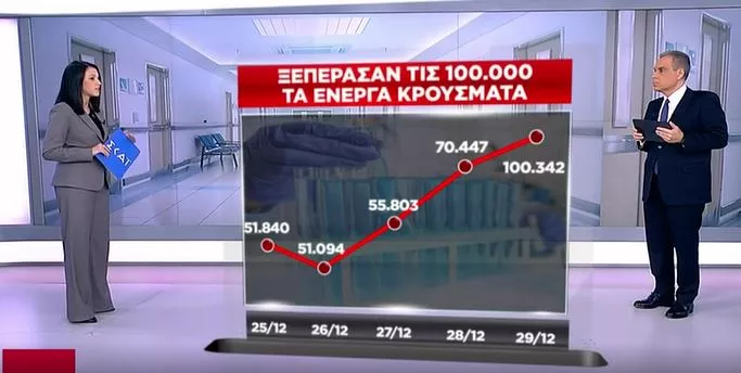 Παρόμοια αύξηση παρατηρείται και στα ενεργά κρούσματα. Στις 25 Δεκεμβρίου είχαμε 51.840 ενεργά κρούσματα, στις 26/12 51.094, στις 27/12 55803, στις 28/12 70447 και στις 29/12 100.342.
