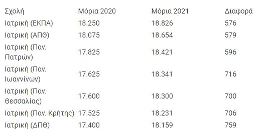 Σε υψηλό κινήθηκαν όλες οι οι Ιατρικές σχολές Η βάση της Ιατρική Αθηνών ανεβηκε από τα τα 18.250 στα 18.826 μόρια. Η Ιατρική Θεσσαλονίκης από τα 18.075 στα18.654, η Ιατρική Πάτρας από τα 17.825 στα 18.421, η Ιατρική Ιωαννίνων από τα 17.625 στα 18.341 716, η Ιατρική Θεσσαλίας από τα 17.600 στα 18.300, η Ιατρική Κρήτης από τα 17.525 στα 18.231 706 και η Ιατρική Αλεξανδρούπολης από τα 17.400 στα 18.159.