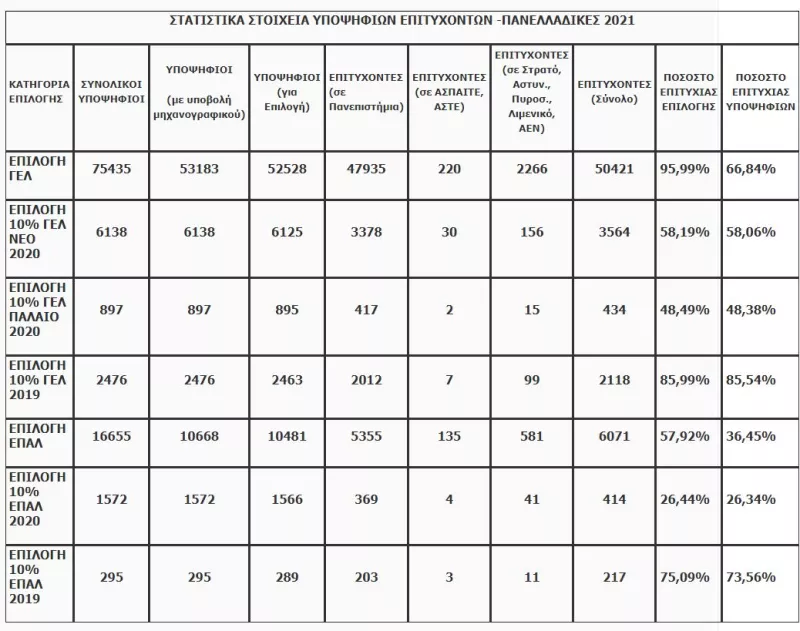 Συνολικά εισήχθησαν στα Πανεπιστήμια, στις Ανώτατες Εκκλησιαστικές Ακαδημίες, στην ΑΣΠΑΙΤΕ, στην ΑΣΤΕ, στις Στρατιωτικές και Αστυνομικές Σχολές και στις Ακαδημίες της Πυροσβεστικής, του Εμπορικού Ναυτικού και του Λιμενικού Σώματος 63.239 υποψήφιοι ΓΕΛ και ΕΠΑΛ.