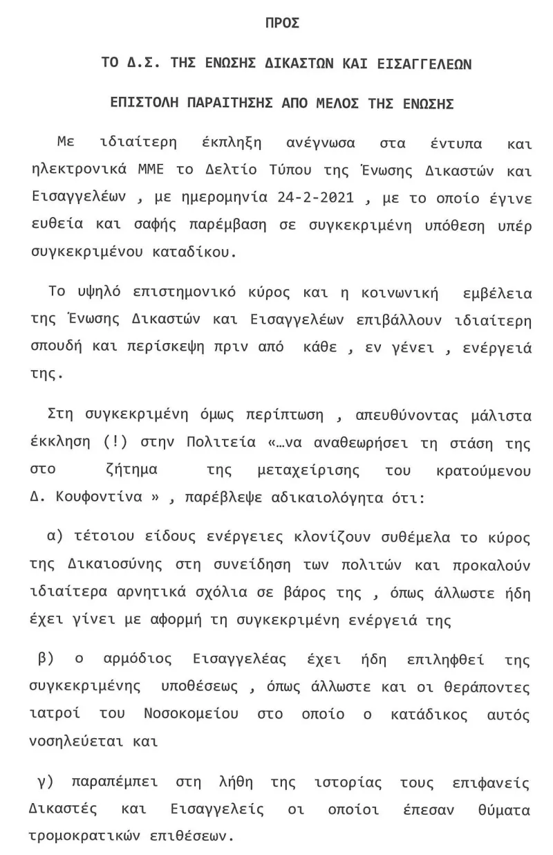 «Με ιδιαίτερη έκπληξη ανέγνωσα στα έντυπα και ηλεκτρονικά ΜΜΕ το Δελτίο Τύπου της Ένωσης Δικαστών και Εισαγγελέων, με ημερομηνία 24-2-2021, με το οποίο έγινε ευθεία παρέμβαση σε συγκεκριμένη υπόθεση υπέρ συγκεκριμένου καταδίκου», επισημαίνει ο αντιεισαγγελέας αφήνοντας σαφές αιχμές, καθώς όπως σημειώνει «το υψηλό επιστημονικό κύρος και η κοινωνική εμβέλεια της Ένωσης επιβάλλουν ιδιαίτερη σπουδή και περίσκεψη πριν από κάθε, εν γένει ενέργειά της».