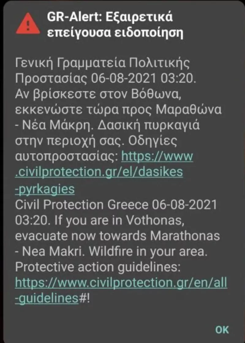 Το πρώτο μήνυμα αναφέρει: « Αν βρίσκεστε στο Πολυδένδρι ή Καπανδρίτι, εκκενώστε τώρα προς Βαρνάβα - Νέα Μάκρη από Επαρχ. Οδό Μαραθώνος - Καπανδριτίου. Δασική πυρκαγιά στην περιοχή σας».