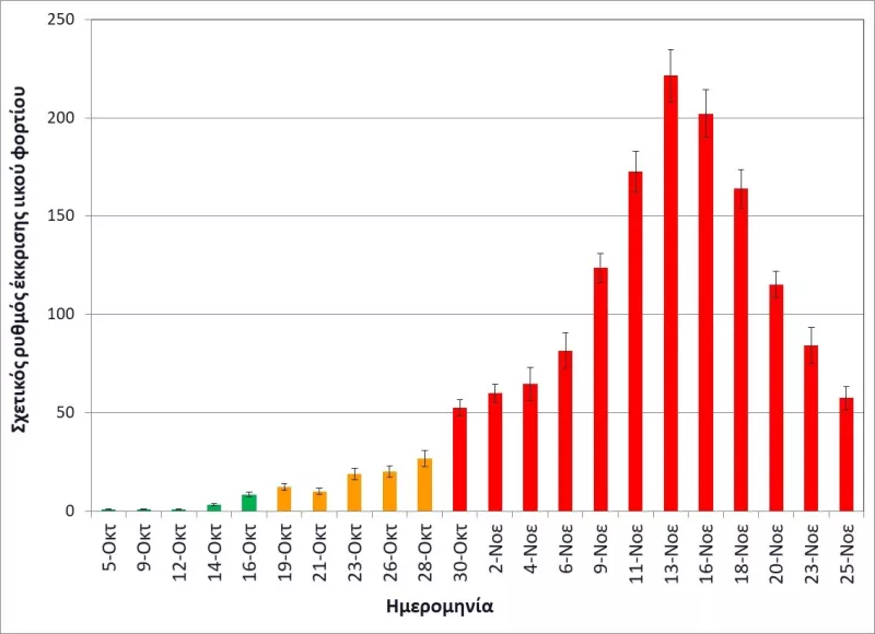 Στο σχετικό διάγραμμα του ΑΠΘ, που παρουσιάζει το ΑΠΕ-ΜΠΕ, οι ημέρες των δειγματοληψιών που καταγράφονται με κόκκινο χρώμα αντιστοιχούν σε περισσότερα από 500 κρούσματα -όπως ανακοινώθηκαν τις αντίστοιχες ημέρες από τον ΕΟΔΥ- οι μέρες που καταγράφονται με πορτοκαλί σε 100-400 κρούσματα και οι μέρες που καταγράφονται με πράσινο σε λιγότερα από εκατό κρούσματα.