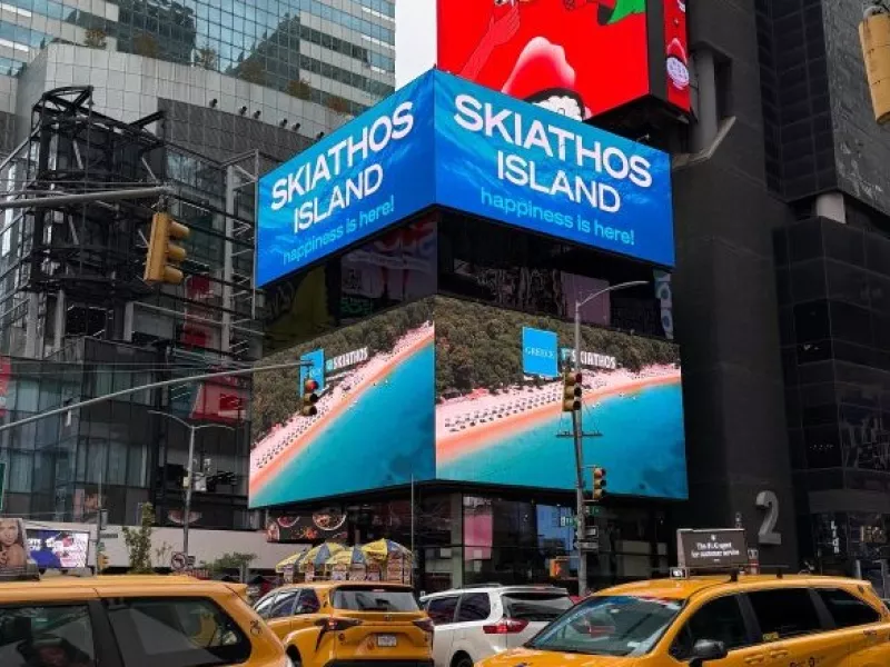 Με δυναμικά οπτικά στοιχεία, εντυπωσιακές εικόνες φυσικού τοπίου και ξεκάθαρη ταυτότητα προορισμού, η προβολή στην Times Square αναδεικνύει τις μοναδικές παραλίες της Σκιάθου και τα κρυστάλλινα νερά της, το βίντεο διάρκειας 10 δευτερολέπτων, προβάλλεται ανά 100 δευτερόλεπτα, όλο το 24ωρο.